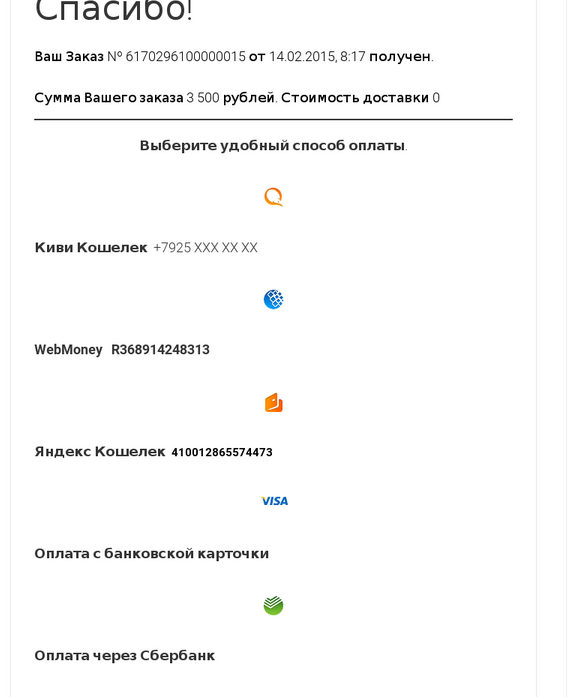 Шаг 4. Перейдите в Ваш почтовый ящик, который Вы указывали при оформлении заказа и выберите удобный способ оплаты. Обычно письмо приходит не более чем через 15-20 минут.
